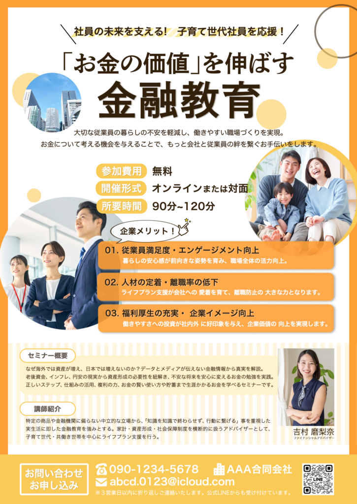 ファイナンシャルアドバイザーとして、上手にお金に使う・貯めるために、家計を見直しをお手伝いする事業を展開されるとのことで、フライヤーのデザインを作成させていただきました。